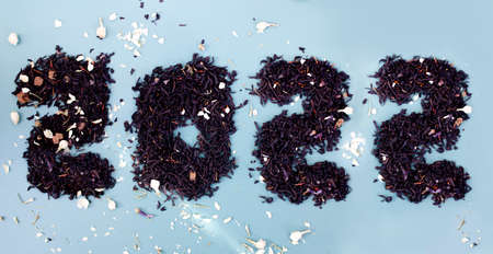 2022. Numbers Tea leaves 2022 on light blue background. Flat lay, top view.
