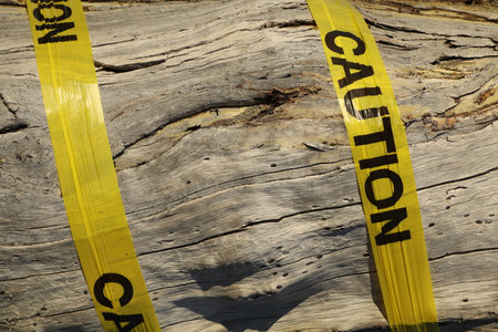 Caution yellow plastic tape placed over dry bare dry trunk of damaged tree