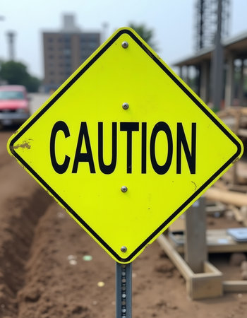 Bright yellow warning sign features an exclamation mark and emphasizes caution for safety in traffic scenarios, encouraging awareness and alertness.