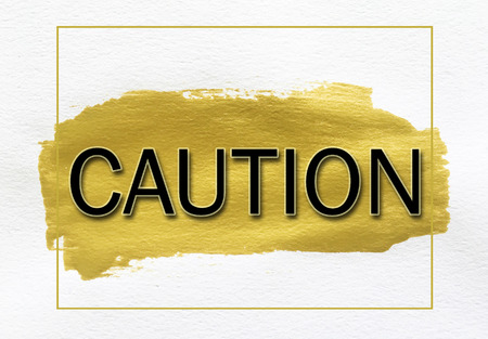 A stark yellow 'CAUTION' stencil is painted across a worn and dirty industrial floor, serving as a clear warning.
