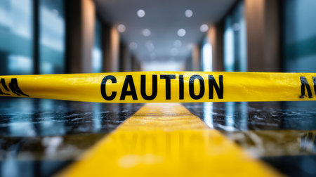 Bright yellow tape forms a temporary boundary on a sleek, glossy corridor floor, with out-of-focus ambient lighting and shiny details enhancing the contemporary atmosphere