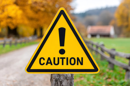Yellow triangular caution warning sign with exclamation mark on a wooden post in an autumn landscape