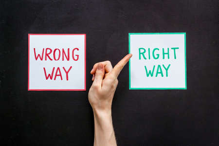 Choice concept. Right and wrong way icons, female hands choose top view