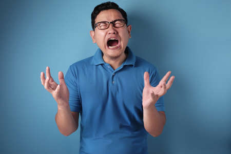 Young Asian man wearing blue shirt shouting because of anger. Against blue background