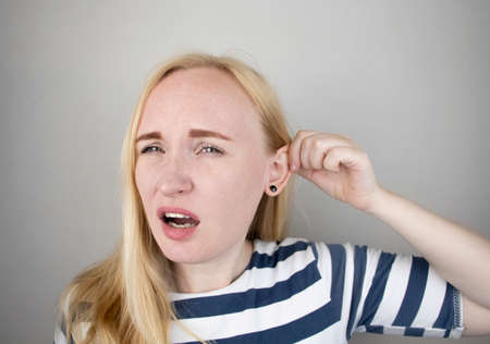 funny, emotional, upset woman holds her hands near her ears listening and looking at the camera with a puzzled expression on her face