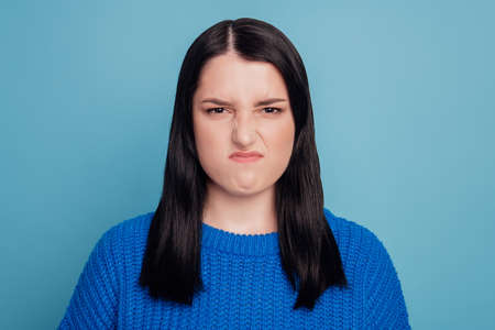 Close-up portrait of her she nice attractive pretty moody capricious girl wear warm dislike isolated blue color background
