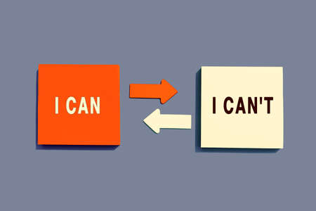 Note paper with arrows between the options of I Can or I Can't on gray background, top view. Motivation concept