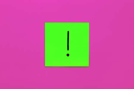 Forget, reminder, combination of colour concept- Close up black handwritten symbol of exclamation mark on one yellow square sticker on blue background with copy spase, horizontal orientation.