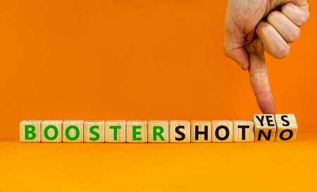 Covid-19 booster vaccine shot yes or no symbol. Doctor turns cubes and changes words booster shot no to booster shot yes. Beautiful orange background copy space. Covid-19 booster vaccine shot concept.
