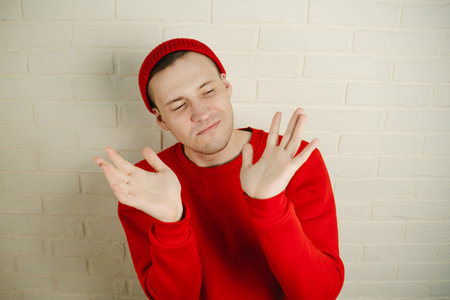 A man in a red hoodie and hat dances against a white brick wall.