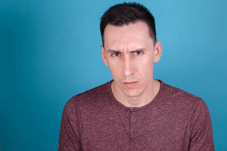 portrait of a young discontented man on a dark blue background who looks straight