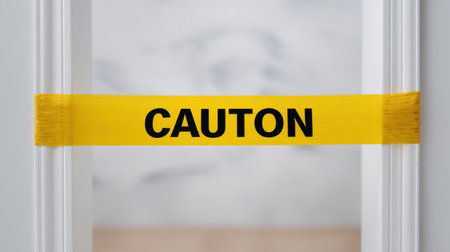 Bright yellow caution tape blocks an entryway in a clean indoor space, emphasizing safety and alertness. Perfect for themes related to precautions and hazards.