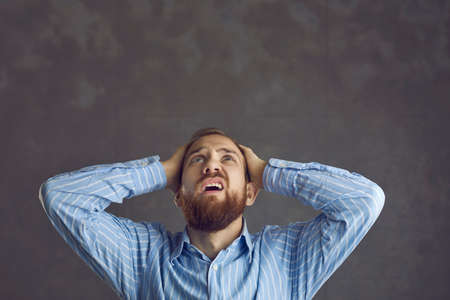 Frustrated upset business man holding head with hand looking up have trouble think for what studio shot on grey background. Negative people emotion and facial expression. Stress and overworked problem