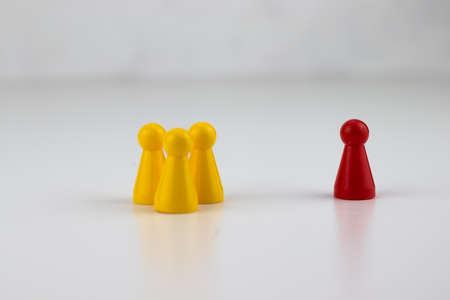 Red and yellow pawns on a white background. The concept of leadership and teamwork.