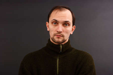 young man in an old sweater on a dark background. studio portrait