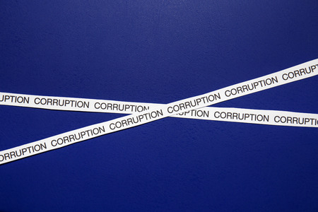 Strips of paper with words CORRUPTION on blue background