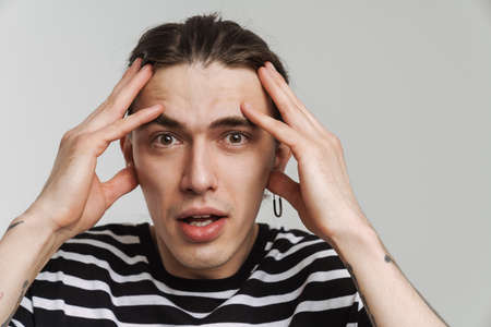 Portrait of a stressed young man with hands on his head isolated on white background