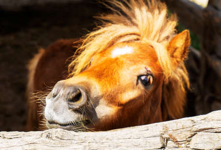 Portrait of a horse, pony, brown horse. Horse on petting zoo.