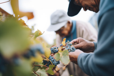 A man is shown working in a vineyard, meticulously picking ripe grapes from the vines. The image features a shallow depth of field, with a focus on the hands and fruit. The grapes are a deep purple, and the leaves are lush green. This visual could be used for illustrating agriculture, food production, or wine-making.