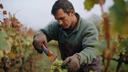 Worker harvesting grapes in a vineyard during autumn with focus on labor and nature