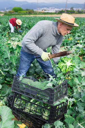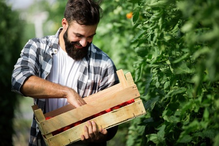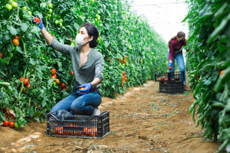 Focused latin american farm worker gathering crop of organic tomatoes cultivar in hothouse. Spring harvest time
