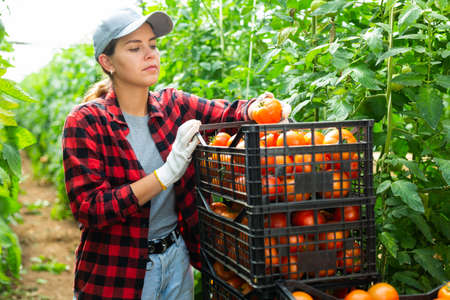 Woman farmer hand harvesting crop of ripe red tomatoes in greenhouse