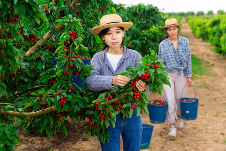 Seasonal farm worker hanged a full basket of sweet black lapins cherries on his neck. Cherry harvest in the organic orchard
