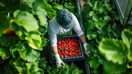 A worker harvesting strawberries into a crate surrounded by vibrant greenery in a greenhouse.