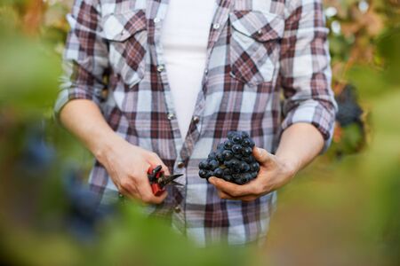 Farmer picking crop of grapes on ecological farm. Man cutting bunch of blue table grapes with pruner and puts it in box. Gardening, farming concept