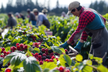 Farm workers are picking ripe blackberries and raspberries on a sunny day on a large berry farm