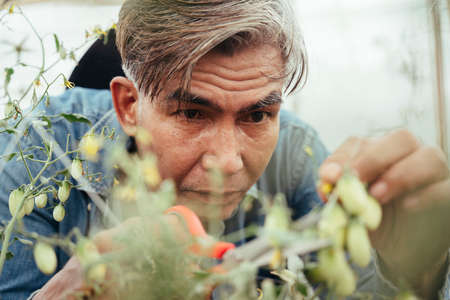 Asian elderly senior farmer harvest fresh little tomatoes with scissor in greenhouse.