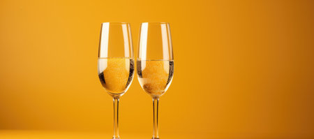 Two glasses of champagne on a yellow background. Horizontal photo.