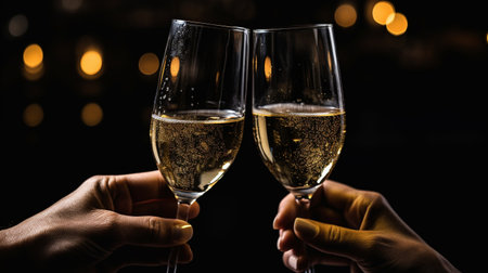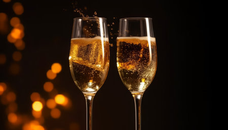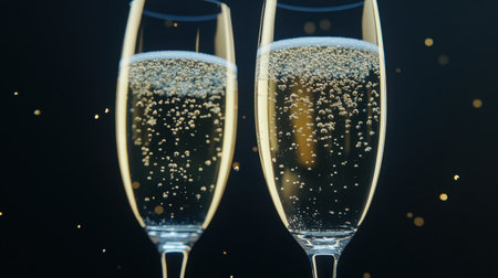 Two elegant champagne flutes filled with a sparkling drink, set against a dark background, exuding a festive atmosphere perfect for celebrations.