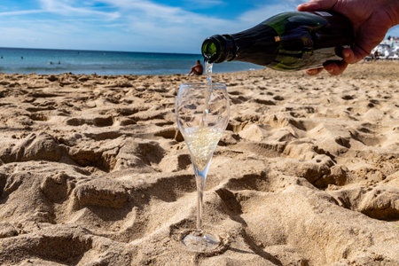 Pouring of Spanish cava sparkling wine is glasses with view on blue sea and sandy beach, Costa del Sol summer vacation destination, Andalusia, Spain