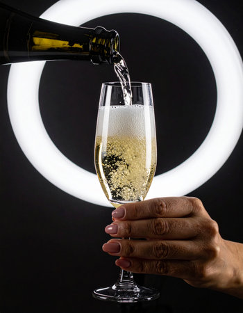 A glass of champagne with bubbles in it. The bubbles are small and scattered throughout the glass. Concept of celebration and enjoyment, as the bubbles suggest that the champagne is being poured