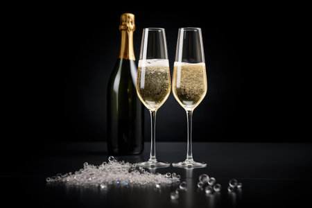Two glasses with champagne next to bottle on mirrored surface against black background, copy space.