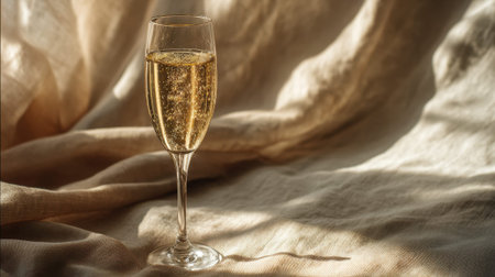 A hand holds a champagne glass filled with a golden liquid, illuminated by sunlight streaming through a window. The scene features a neutral color palette, highlighting the glass and shadows. The composition suggests relaxation and celebration, suitable for various editorial and commercial applications.