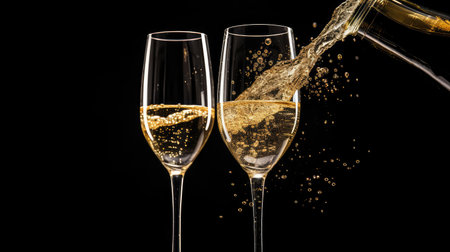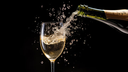 celebration theme with splashing champagne in filling wineglass with bottle on black background. Neural network generated in May 2023. Not based on any actual person, scene or pattern.