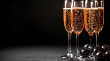 Four sparkling flutes sit elegantly, accompanied by dark grapes in soft light.