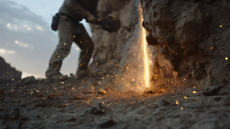 A captivating image capturing the dynamic action of crushed stones falling amidst a cloud of dust in a construction zone, highlighting the energy and disruption involved.