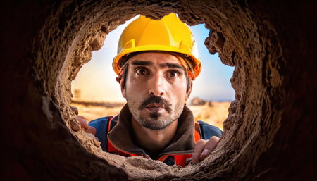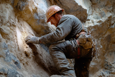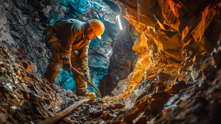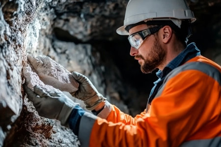 A mining engineer is focused on examining mineral samples in an underground tunnel, using tools to analyze the materials in a well-lit area. Protective gear enhances safety during the process.