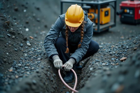 Worker laying a cable. A female utility worker in a hard hat installs a pink communication cable in a trench outdoors.