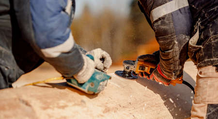 Industrial work carpenter grinds log with electric jointer, construction frame building site of house made of wood