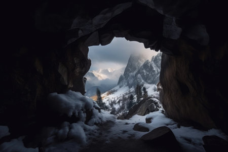 mountain cave with snow-covered entrance, surrounded by majestic snowy peaks, created with generative ai