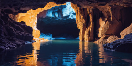 Mysterious underground river flowing through dark cave illuminated by faint light