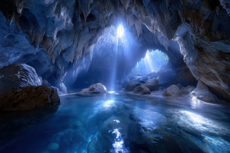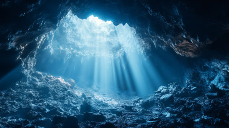Sunbeams shining through hole in cave ceiling, illuminating dark blue rocky bottom