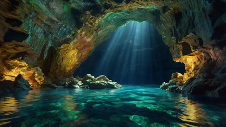 Inside an underground cave, light filters through rock formations, revealing stunning textures and colors. The scene captures the allure of natures artistry in a hidden, mysterious world.