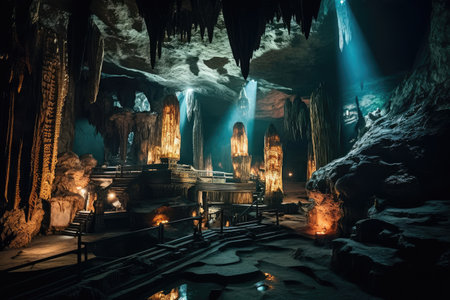 Discover the enchanting interior of a mysterious cave, featuring dramatic lighting and fascinating rock formations that create an atmosphere of intrigue and exploration.