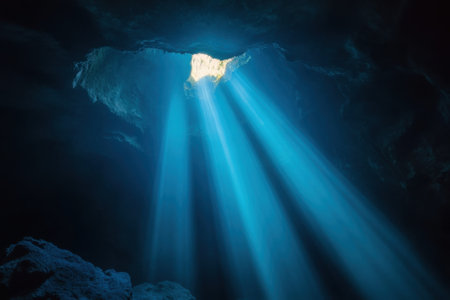 Stunning natural light filters down into an underwater cave, illuminating its mysterious depths and textures.