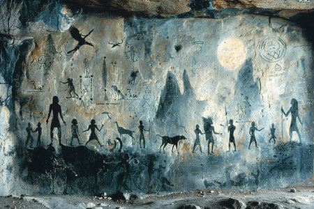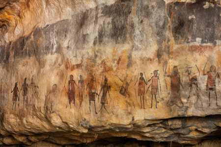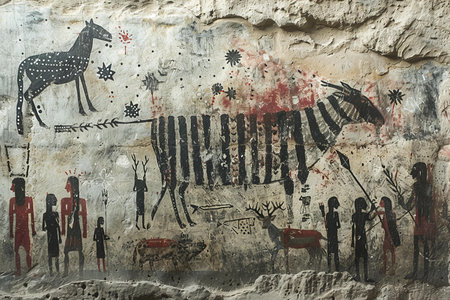 Gorgeous 3d illustration of primitive ancient art on a cave surface with figures of people with spears, arrows and bows chasing antelopes and elephants.